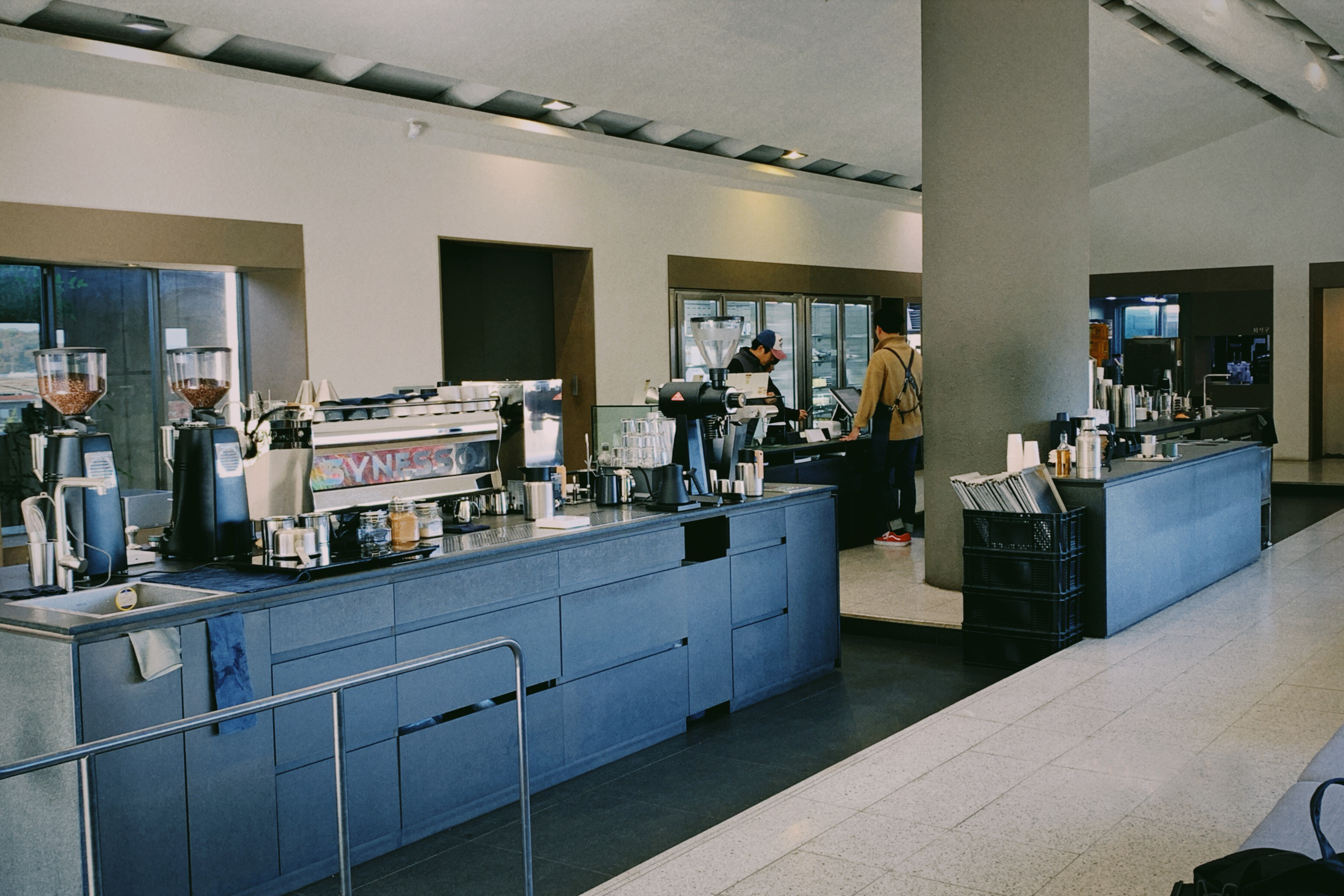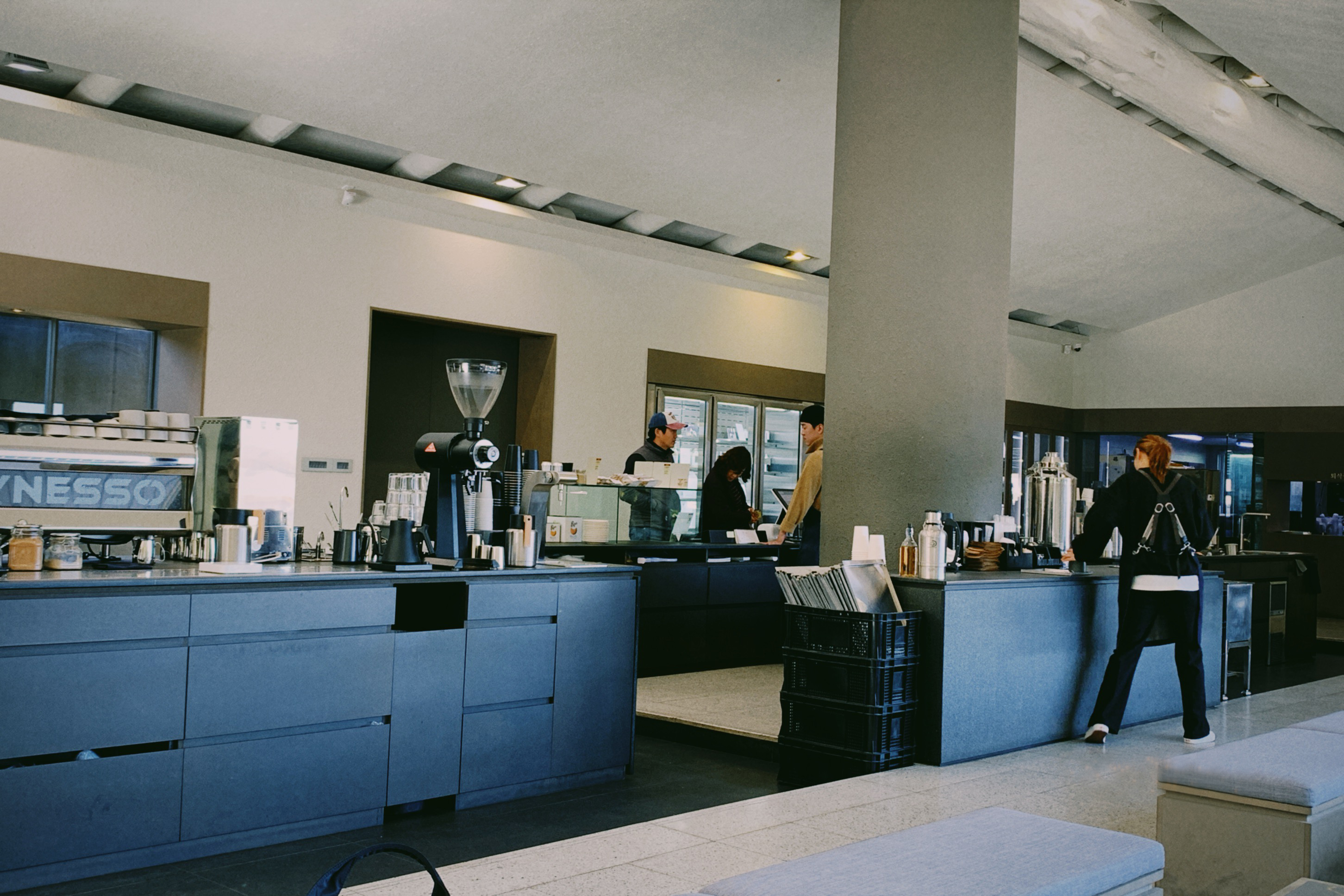 특이한 디자인의 건축물 와 내부는 중앙에는 카운터와 커피와 밀크티를 만드는 주방이 있는데