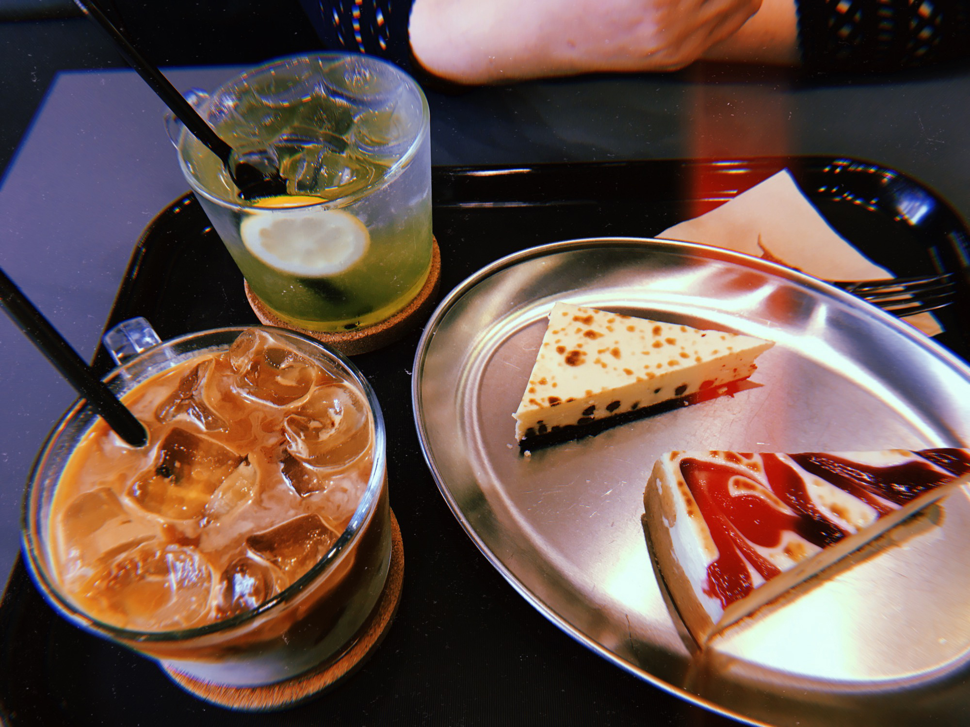 아이스 라테를 주문하고 두 종류의 치즈케이크 (라즈베리, 기본인 치즈케이크)와 청포도 에이드를 주문했다.