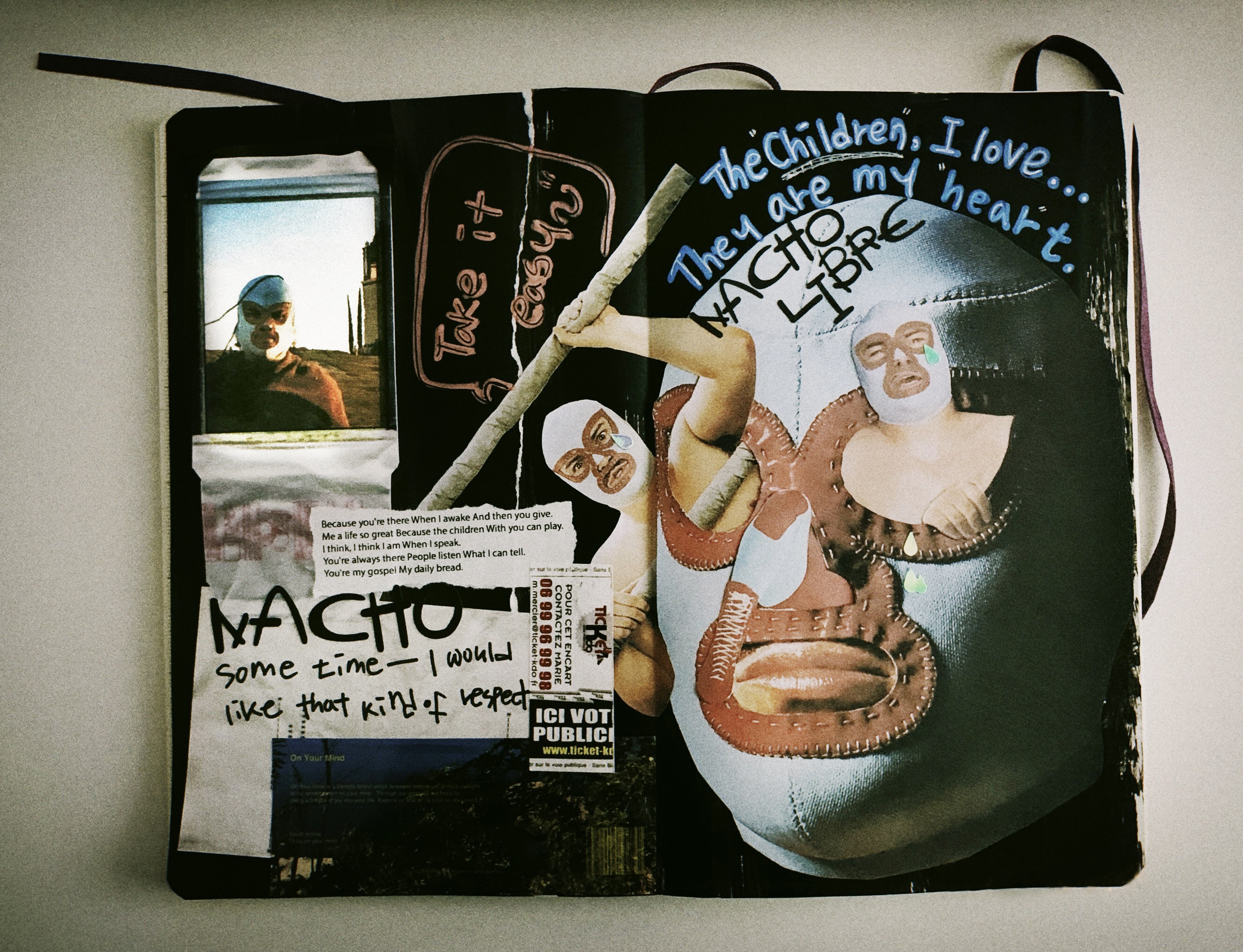 낙서가 있던 자리는 검은 아크릴 물감으로 가리고 대충 자리 잡고 붙이고 자르고를 반복하니 완성!