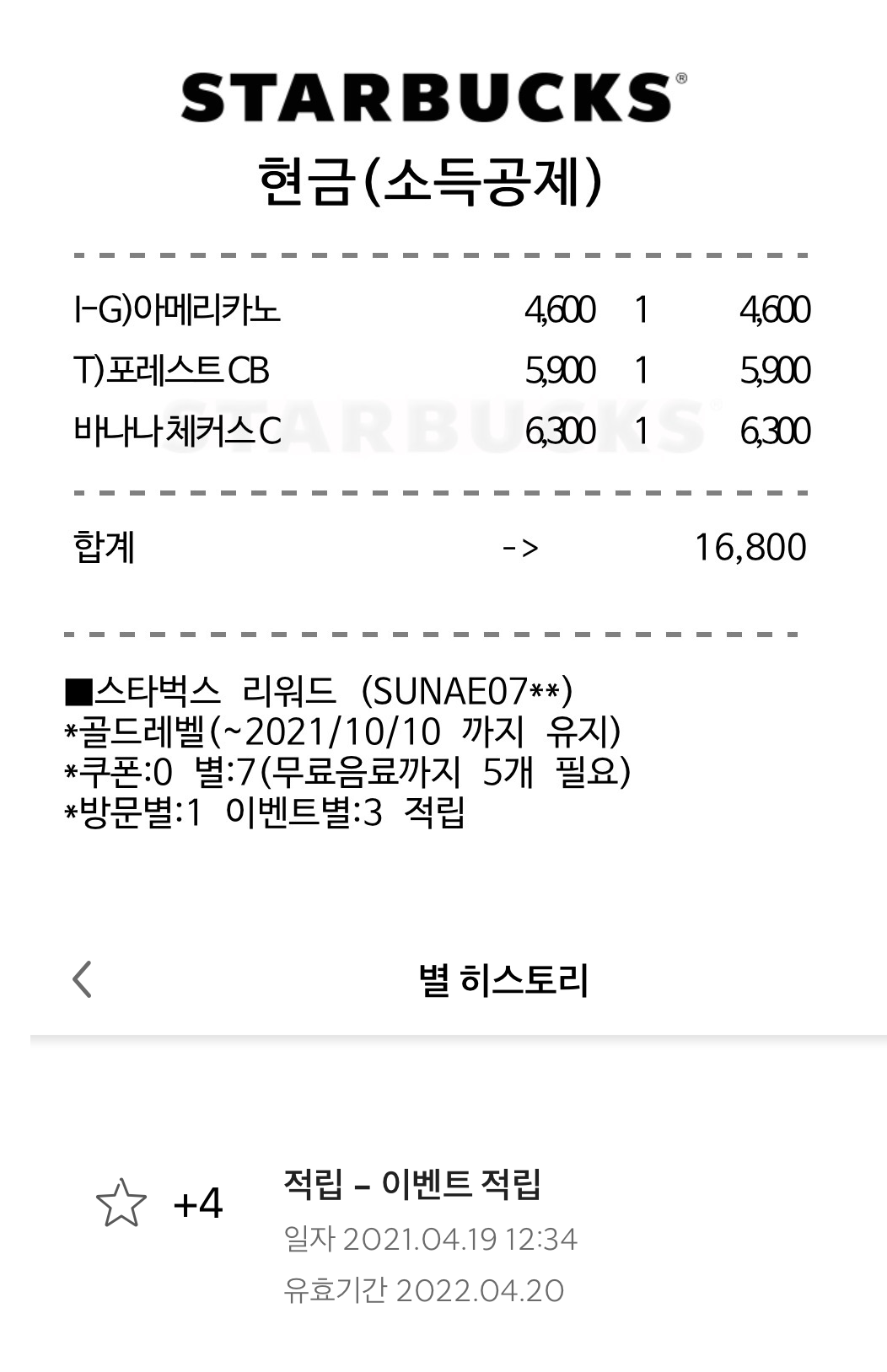 근데 왜 난 사이렌 오더로 주문 안 한 거 같은데 별 3개와 스타벅스 방문 별 1개 총 4개의 별을 주셨단 말이지,