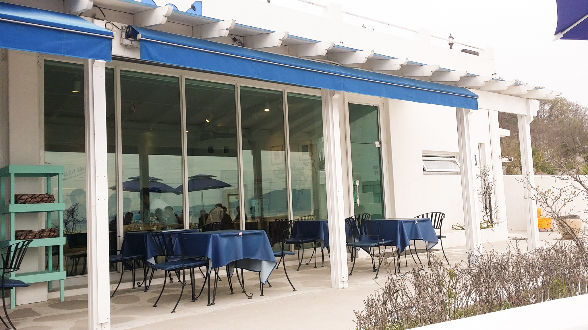 흰색과 파란색의 조화 카페 앞으로 보이는 바다의 정경은