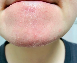 턱 (턱 라인, 목 주변)에 화이트 트러블과 화농성 트러블